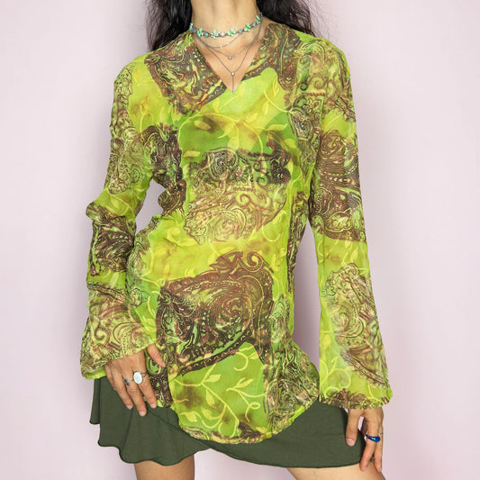 Vintage Y2K Green Paisley Sheer Flared Sleeve Blouse – Size L