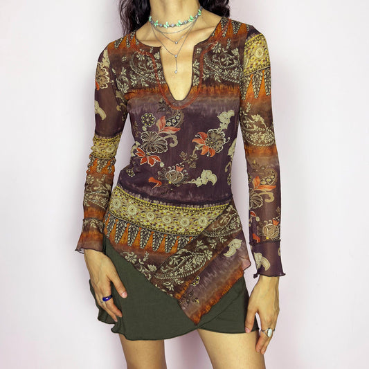 Vintage Y2K Floral Paisley Mesh Asymmetric Long Sleeve Top – Size XS