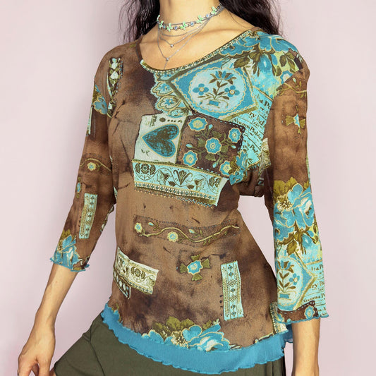 Vintage Y2K Brown Blue Sheer Mesh Patchwork Top – Size XXL