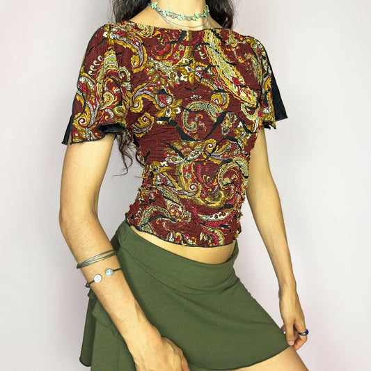 Vintage Y2K Maroon Paisley Crinkle Mesh Split Sleeve Top – Size XS