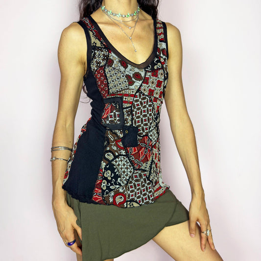 Vintage Y2K Scarf Print Asymmetric Patchwork Mesh Top – Size M
