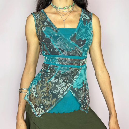 Vintage Y2K Teal Wrap Asymmetric Sheer Floral Mesh Top – Size L