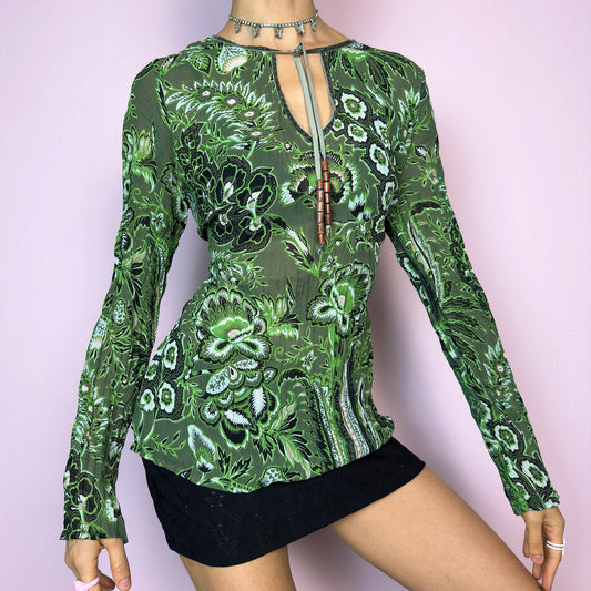 Vintage Y2K Green Tie Front Floral Print Semi Sheer Top – Size M
