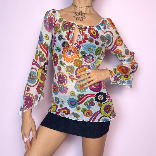 Vintage Y2K Floral Bell Sleeve Mesh Tie Front Top – Size L