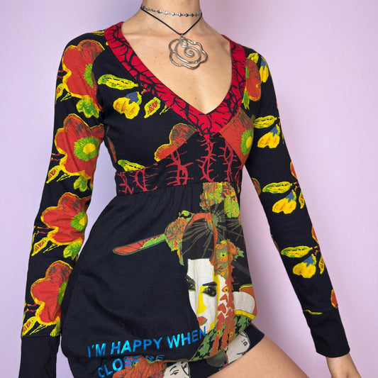 Vintage Y2K Desigual Tie Back Asymmetric Patchwork Top – Size L