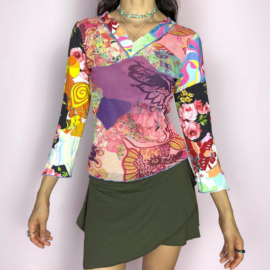 Vintage Y2K Colorful Art Print Mesh Top – Size L
