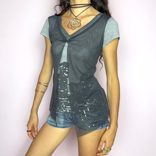 Vintage Y2K Gray Sheer City Skyline Print Mesh Top – Size M