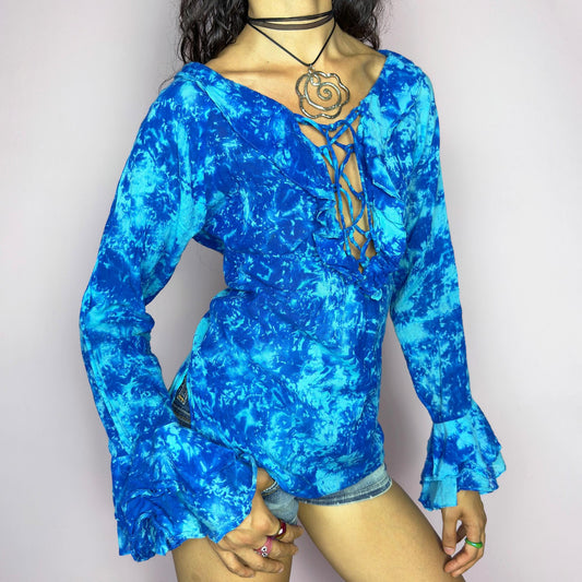 Vintage 90s Blue Lace Up Tie Dye Ruffle Blouse – Size M