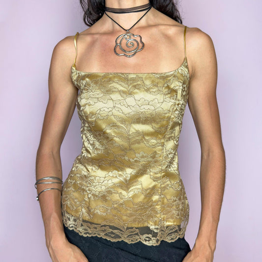 Vintage Y2K Black Gold Sheer Lace Up Corset Top – Size S
