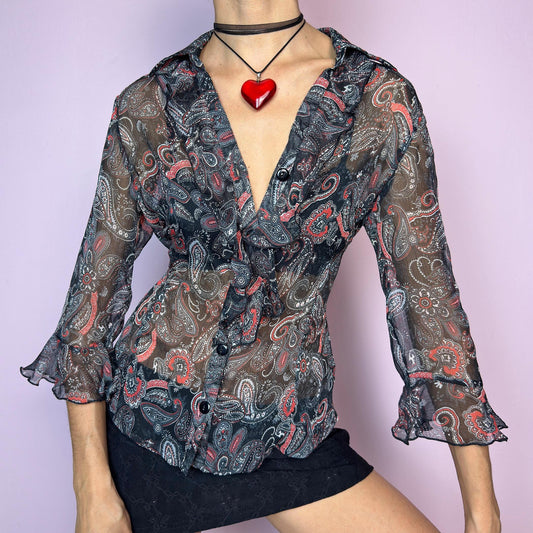 Vintage Y2K Asymmetric Paisley Sheer Blouse – Size M