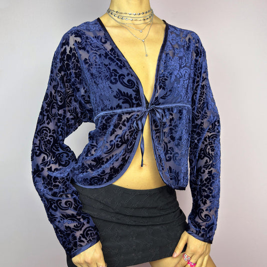 Vintage 90s Blue Velvet Devore Tie Front Sheer Blouse – Size L