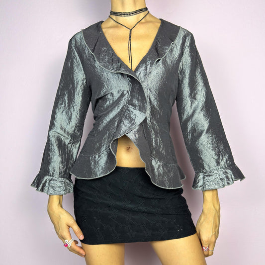 Vintage 90s Gray Iridescent Ruffle Crinkled Metallic Blouse – Size M