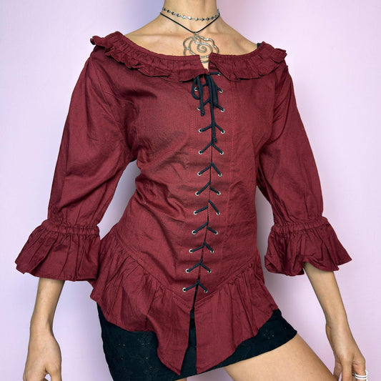 Vintage 90s Maroon Ruffle Lace Up Corset Top – Size L