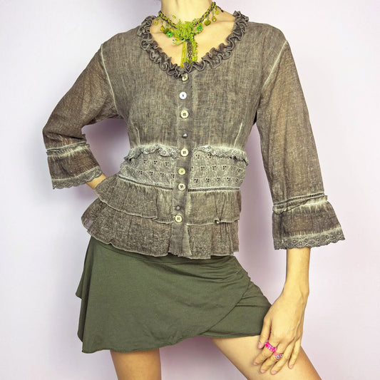 Vintage Y2K Brown Lace Trim Frill Ruffle Blouse – Size L