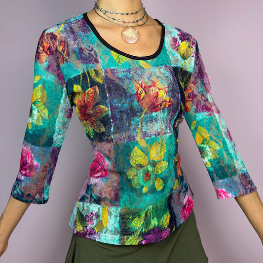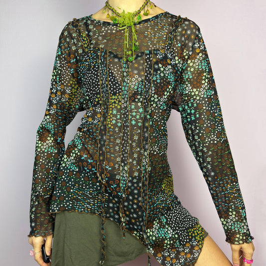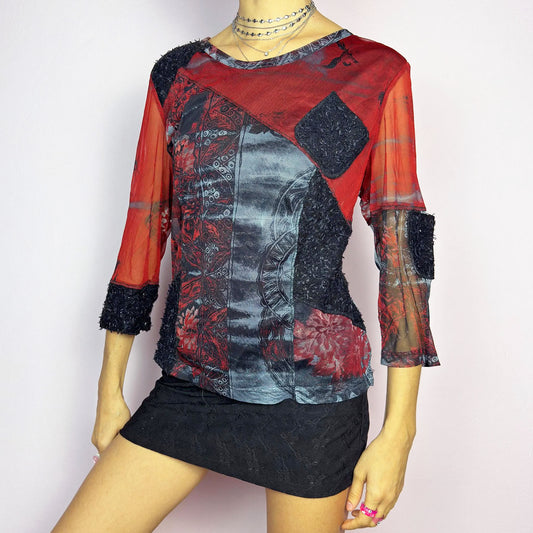 Vintage Y2K Mesh Appliqué Sheer Patchwork Top – Size XL