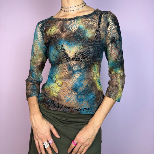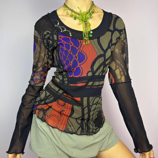 Vintage Y2K Abstract Print Sheer Long Sleeve Mesh Top – Size L