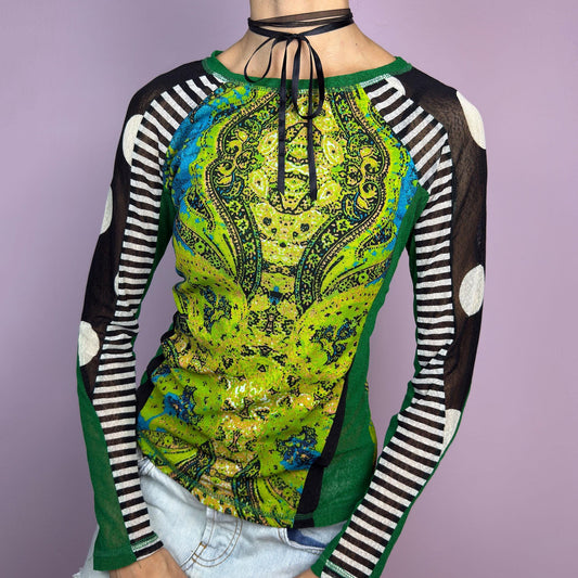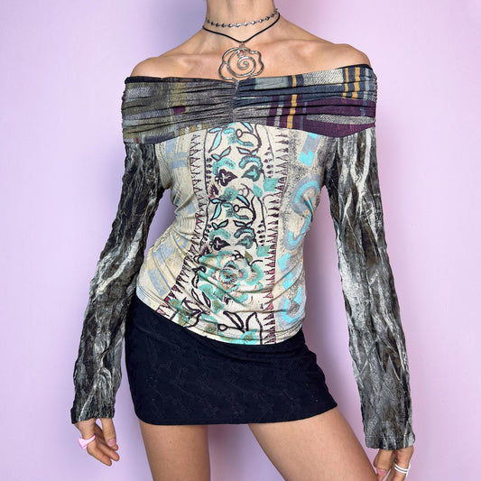 Vintage Y2K Art Print Off Shoulder Long Sleeve Mesh Top – Size S