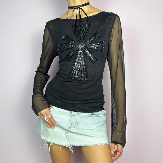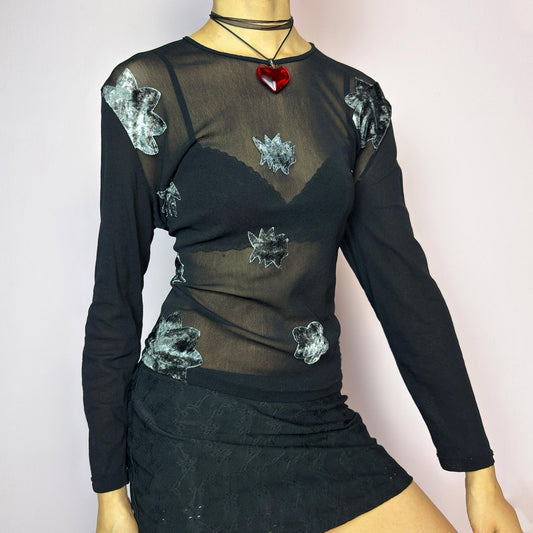 Vintage Y2K Black Mesh Sheer Appliqué Top – Size XL