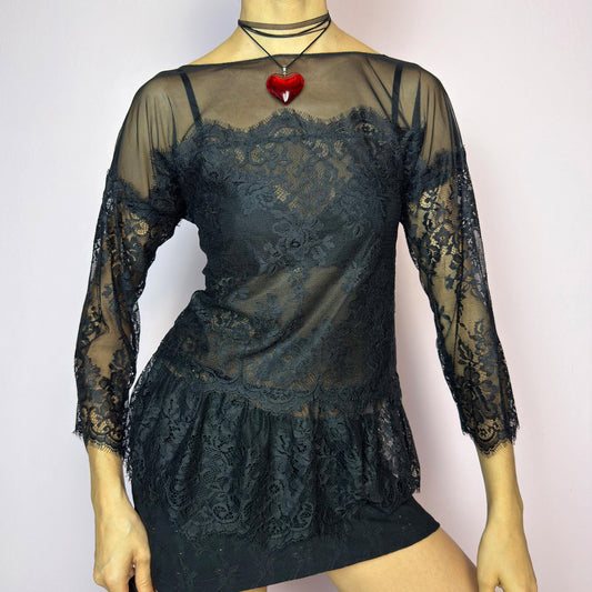 Vintage Y2K Black Lace Sheer Peplum Top – Size S