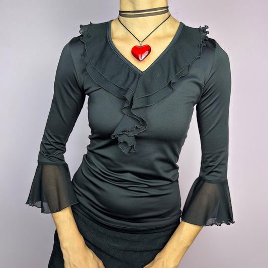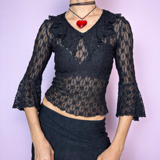 Vintage Y2K Black Ruffle Bell Sleeve Sheer Mesh Top – Size XXS