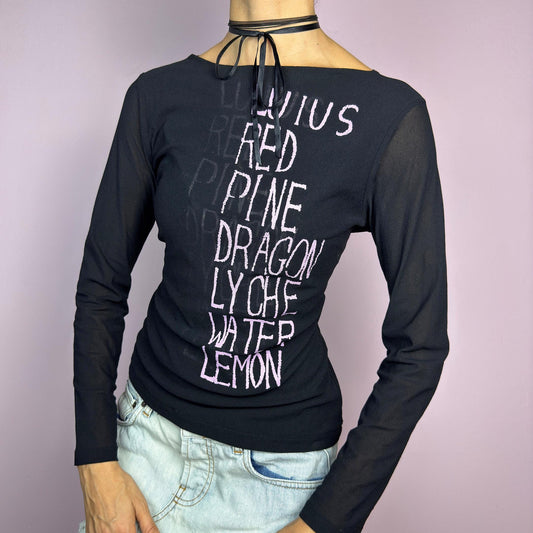 Vintage Y2K Black Text Print Sheer Graphic Mesh Top – Size M