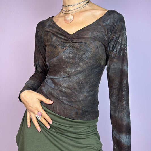 Vintage Y2K Brown Shimmer Ruched Bust Tie Dye Top – Size S