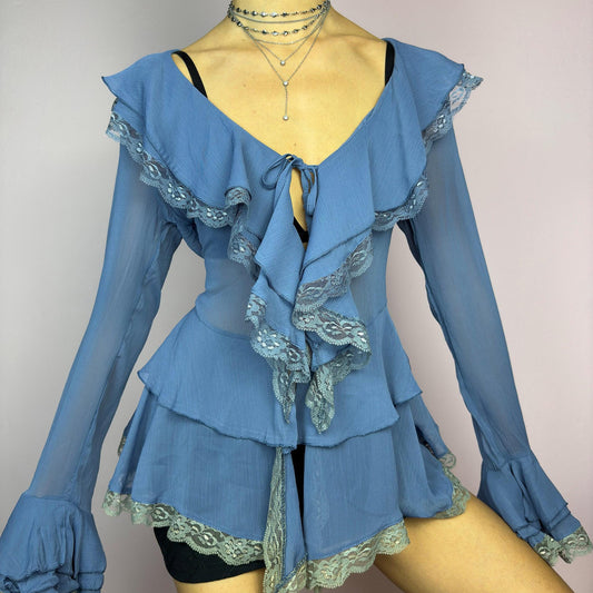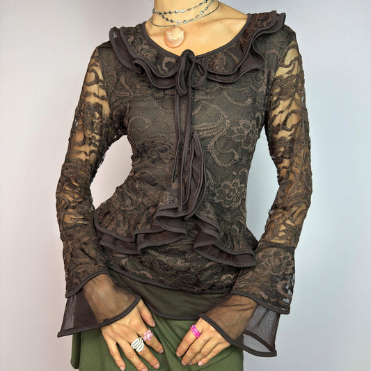 Vintage Y2K Brown Lace Ruffle Sheer Bell Sleeve Top – Size M