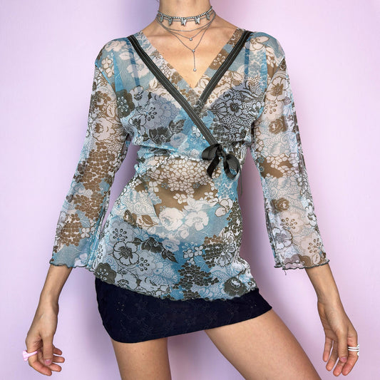 Vintage Y2K Floral Mesh Sheer Wrap Top – Size L