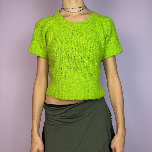 Vintage Y2K Lime Green Cropped Short Sleeve Knit Top – Size M