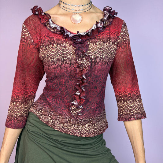 Vintage Y2K Maroon Burgundy Lace Ruffle Mesh Top – Size L