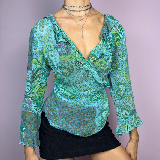 Vintage Y2K Green Blue Paisley Ruffle Tie Back Wrap Blouse – Size L