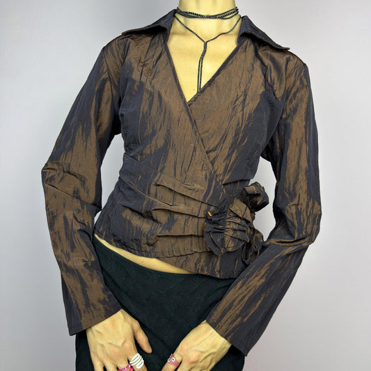 Vintage 90s Brown Iridescent Crinkled Tie Wrap Blouse – Size M