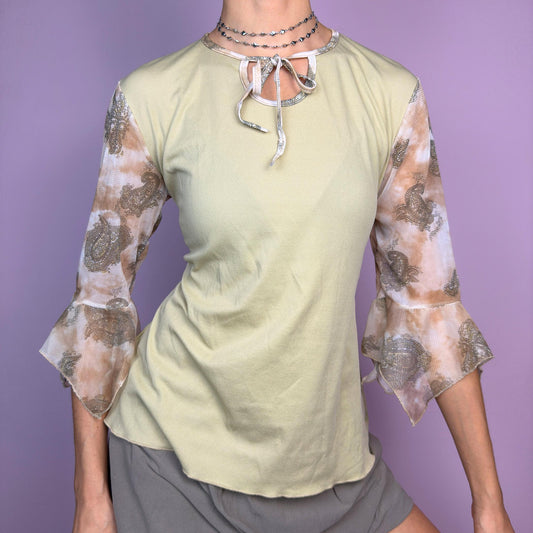 Vintage Y2K Beige Bell Sleeve Paisley Sheer Mesh Tie Neck Top – Size L