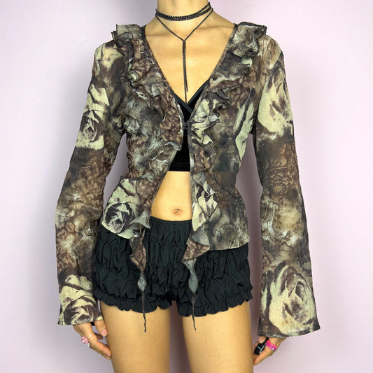 Vintage Y2K Brown Floral Sheer Ruffle Blouse – Size XXL
