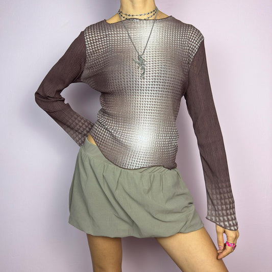 Vintage Y2K Brown Twisted Front Long Sleeve Mesh Top – Size S