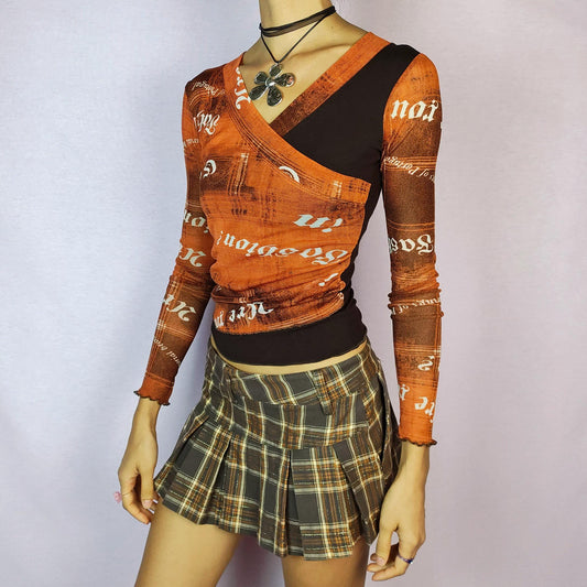 Vintage Y2K Print Mesh Long Sleeve Wrap Top – Size XS