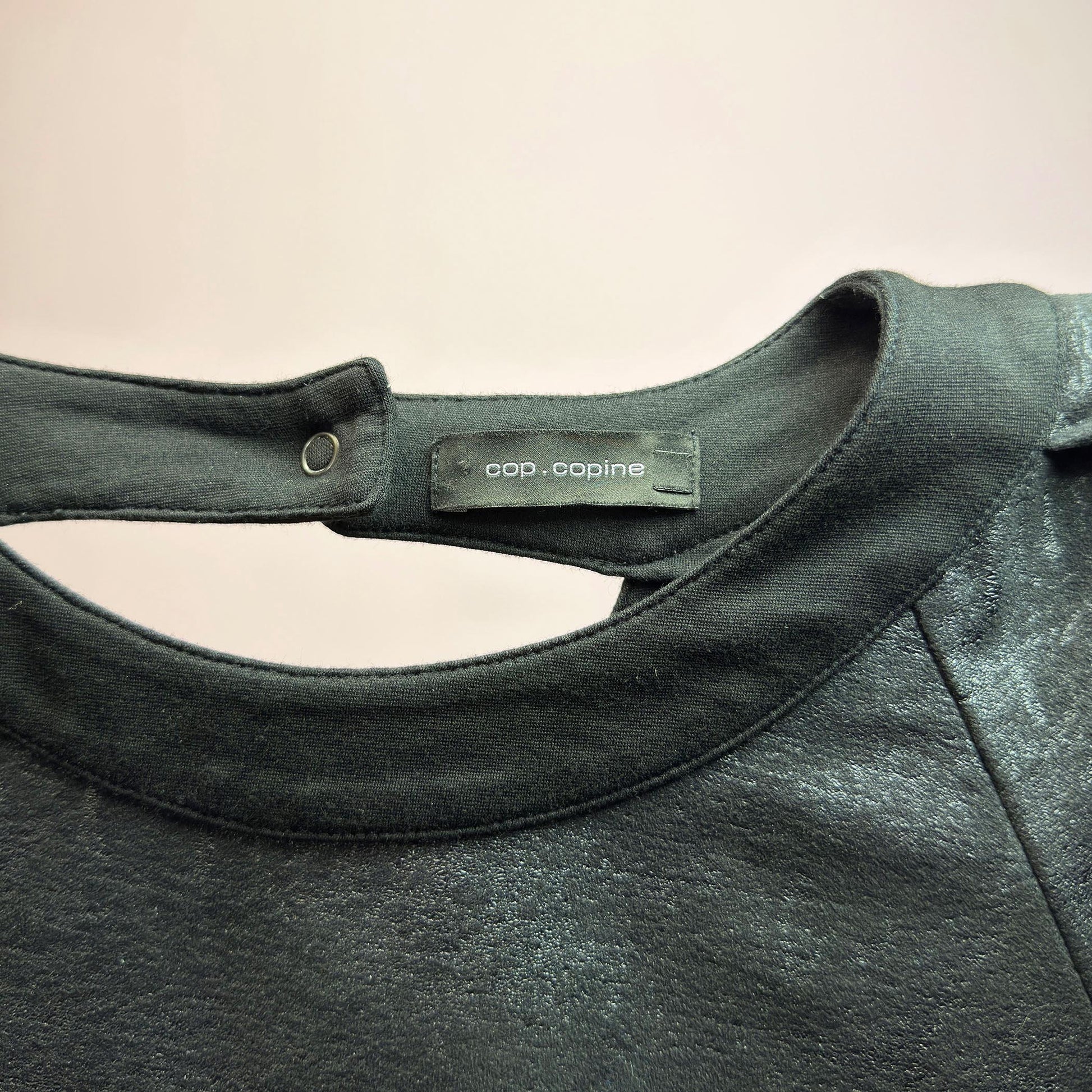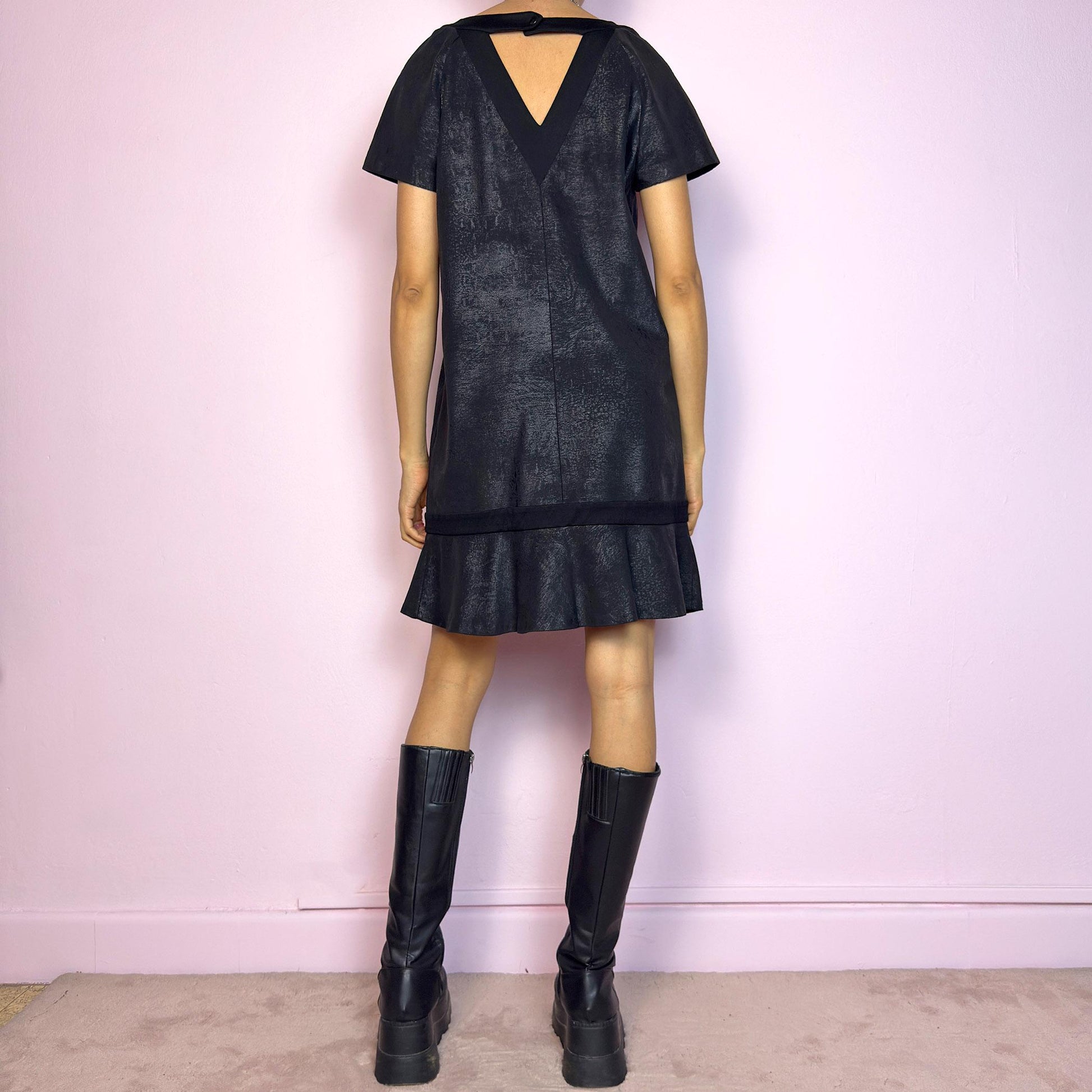 The Y2K Black Cop Copine Dress is a sleek and structured mini dress with subtle futuristic flair. Made from a soft black fabric with a slight sheen and textured abstract finish, it features short sleeves, a relaxed straight silhouette, and a ruffled hem for added movement. The back showcases a bold V-cut detail with a button closure at the neck. Unique yet minimalist, perfect for modern grunge or avant-garde looks. Made in Portugal. Excellent vintage condition.