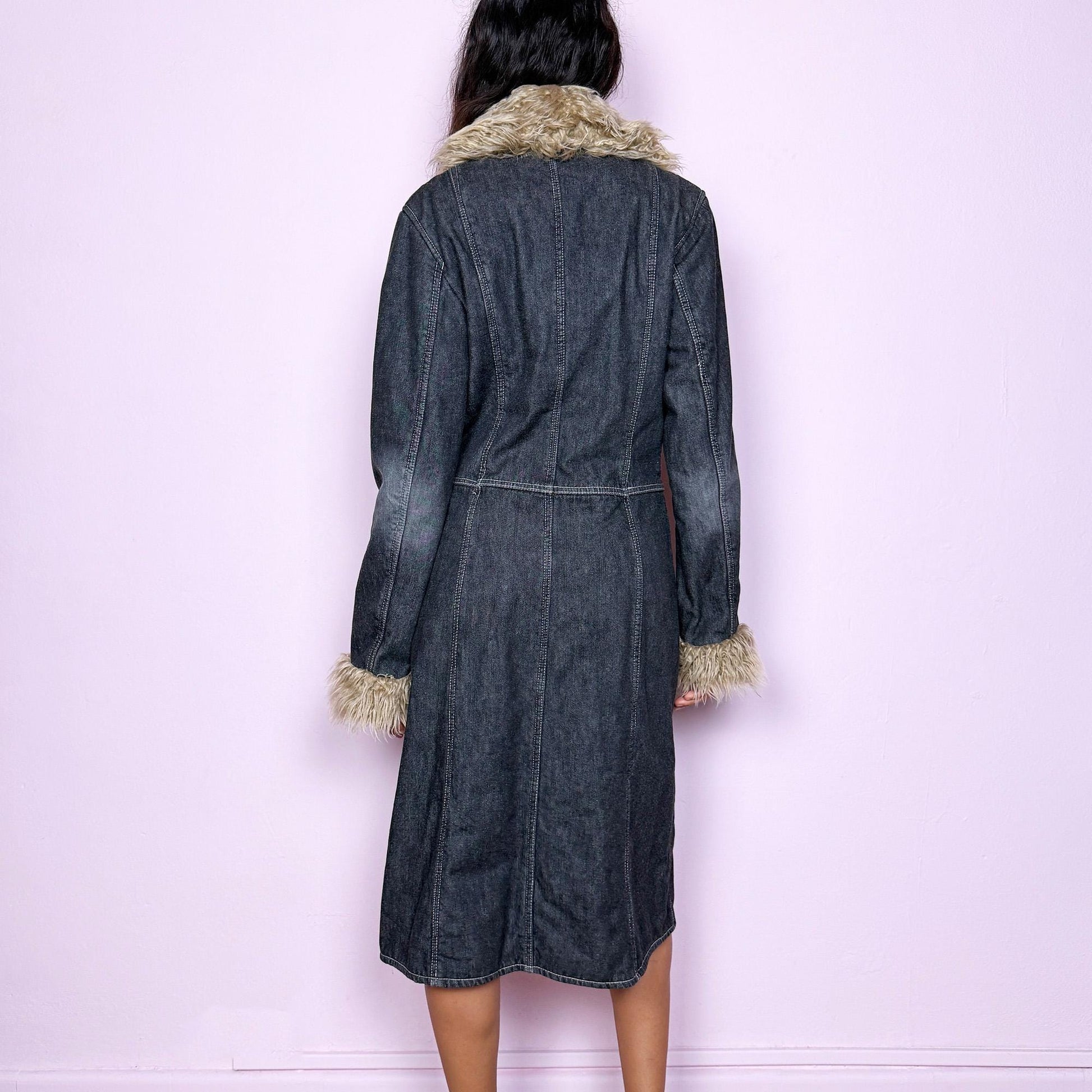 This vintage 2000s long denim Penny Lane coat channels true Y2K edge with a dark gray wash and plush beige faux fur trim along the collar and cuffs. Fully lined in soft brown faux fur for warmth and contrast, it features front button closures, side pockets, and a flattering fitted cut that elongates the silhouette. Effortlessly blending streetwear and bohemian allure, this coat is perfect for winter nights, club looks, or everyday grunge layering. Made from a polyester and acrylic blend. Great vintage condition.